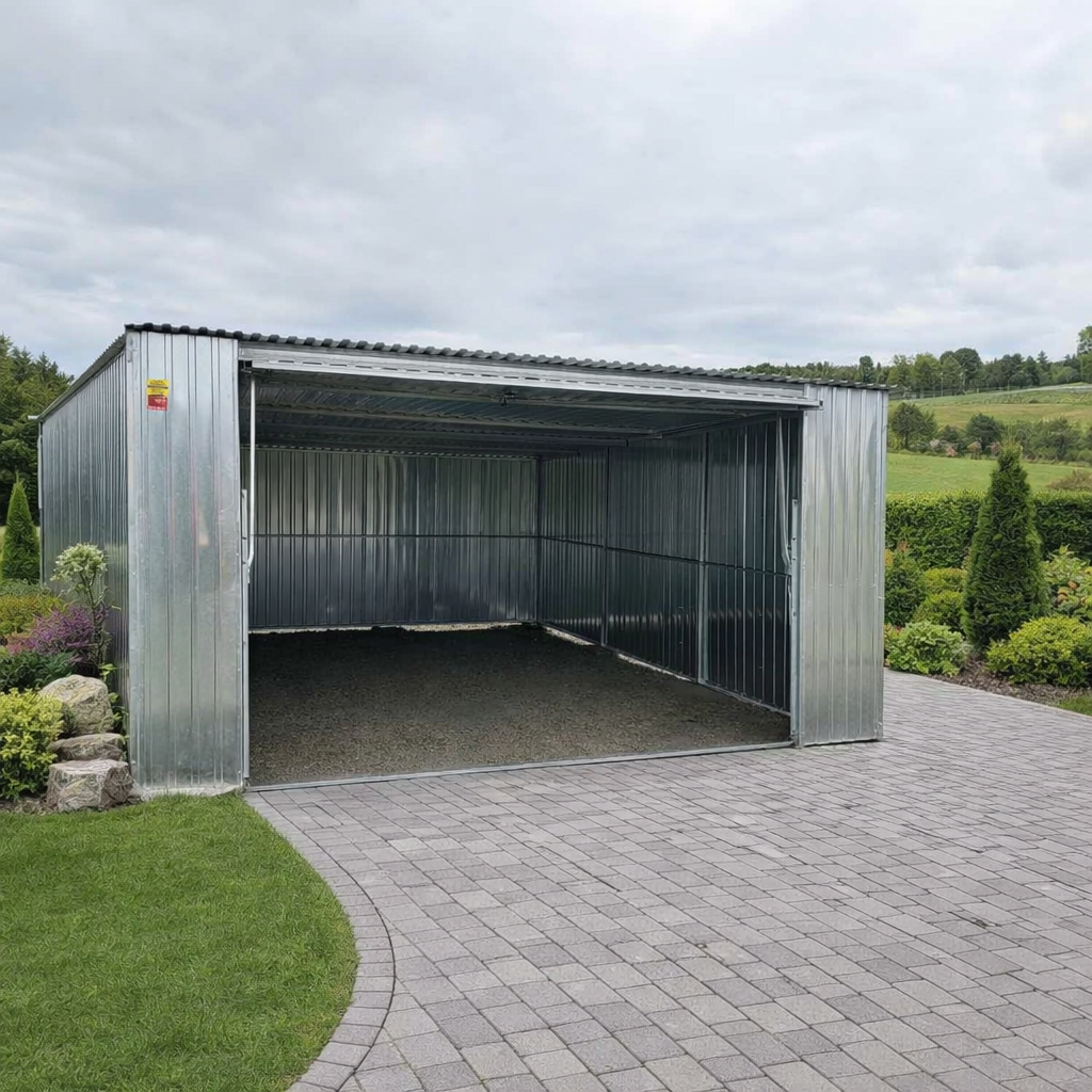 Garaż blaszany 4×6 m – I gatunek to praktyczne i trwałe rozwiązanie do przechowywania samochodu oraz sprzętu. Konstrukcja o szerokości 4 m i długości 6 m została wyposażona w dach ze spadem na tył, zapewniający skuteczne odprowadzanie wody. Wysokość całkowita garażu wynosi 2,18 m z przodu oraz 1,9 m z tyłu.