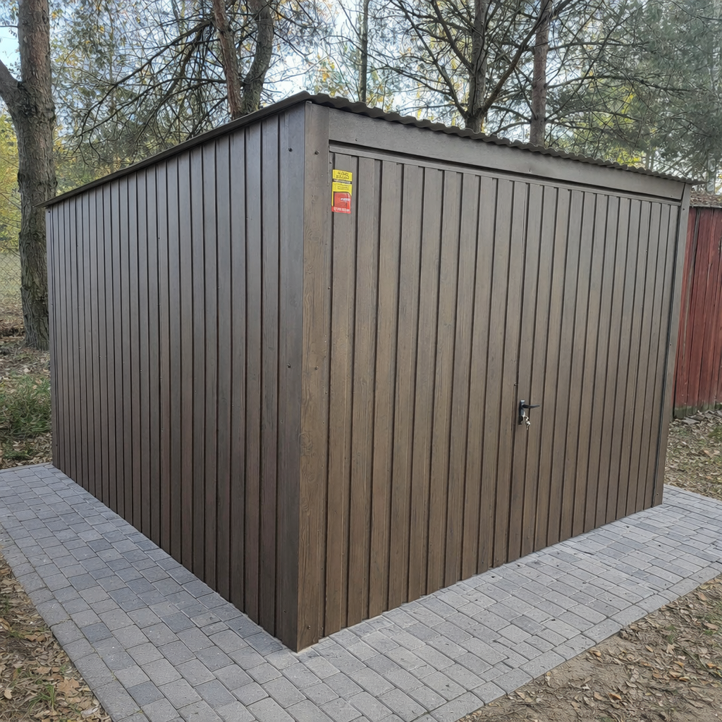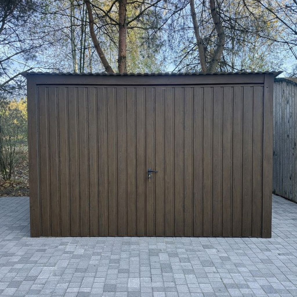 Elegancki garaż blaszany 3×5 m – I gatunek to połączenie trwałości i estetycznego designu. Wykonany z ocynkowanej konstrukcji z kątowników zimno-giętych, gwarantuje stabilność i odporność na korozję przez wiele lat. Pokrycie stanowi blacha trapezowa w kolorze drewnopodobnym orzech z pionowym trapezem, która efektownie imituje drewno, nadając garażowi wyjątkowy i nowoczesny wygląd.