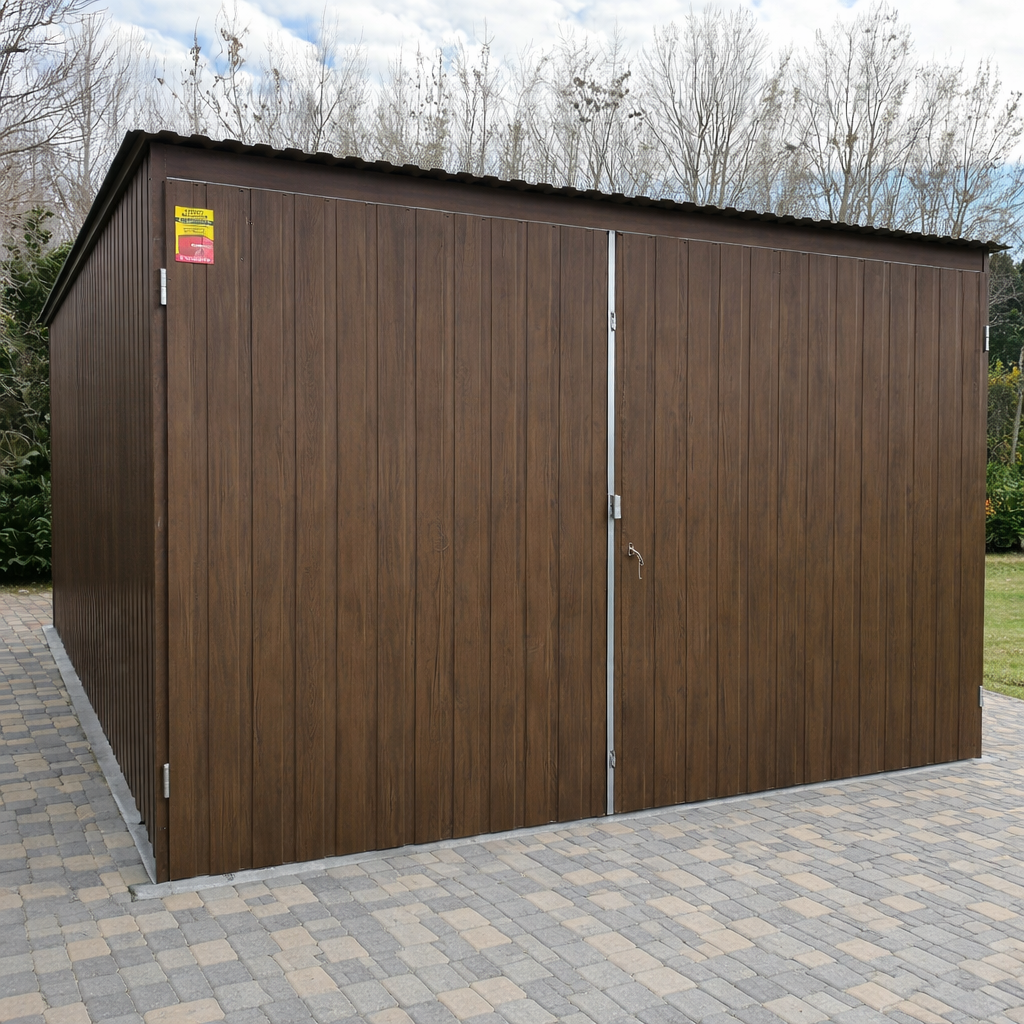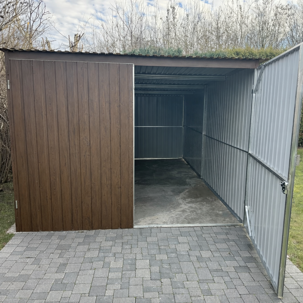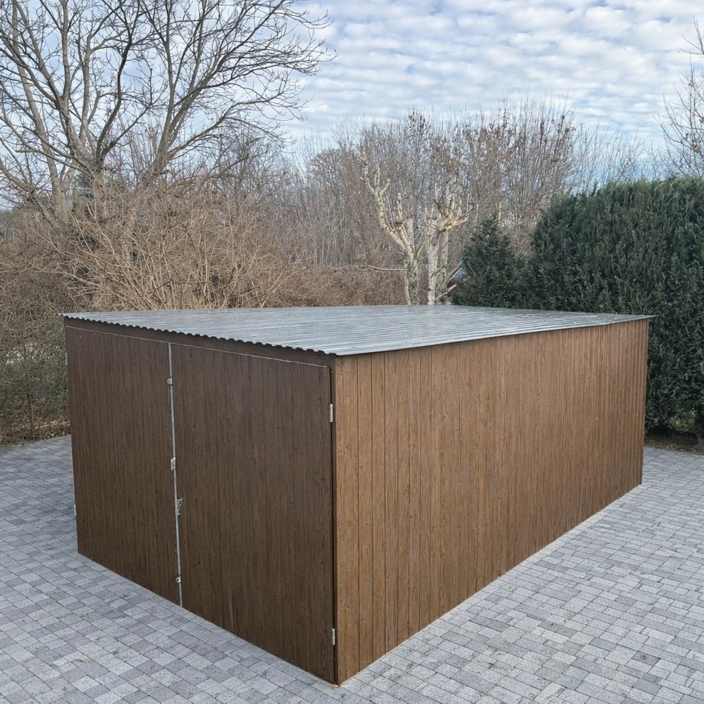 Wyposażony jest w drzwi dwuskrzydłowe o wysokości 2 m (światło wjazdu) i szerokości wjazdu 2,9 m, gwarantujące wygodny dostęp. Ściany wykonano z blachy trapezowej w kolorze drewnopodobnym – orzech, w układzie pionowym, a obróbki blacharskie narożników podnoszą estetykę i trwałość garażu.