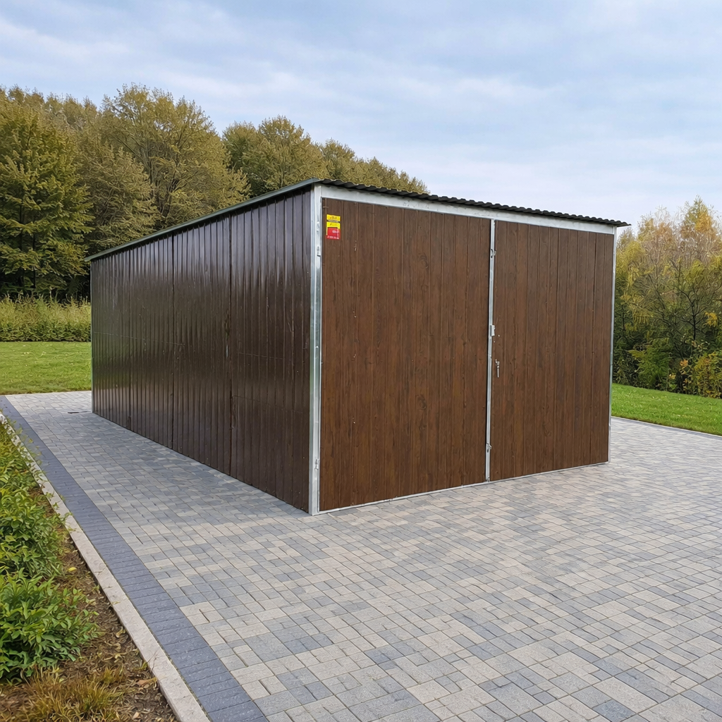 Garaż blaszany 3×5 m (I gatunek) to estetyczna i solidna konstrukcja wykonana z blachy trapezowej drewnopodobnej w kolorze orzech (trapez pionowy), osadzonej na wytrzymałym, ocynkowanym stelażu z kątowników. Dach posiada spad na tył, a wysokość całkowita garażu wynosi 2,13 m z przodu i 1,9 m z tyłu.