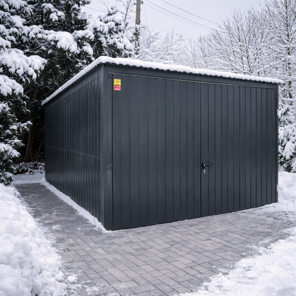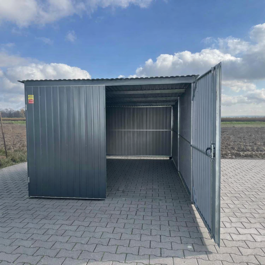 Wyposażony jest w drzwi dwuskrzydłowe o wysokości 2 m (światło wjazdu) i szerokości wjazdu 2,9 m, co ułatwia wygodny wjazd. Ściany wykonane są z blachy trapezowej w kolorze RAL 7016 (grafit) z pionowym układem trapezu, a obróbki blacharskie narożników podnoszą estetykę i trwałość konstrukcji.